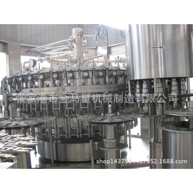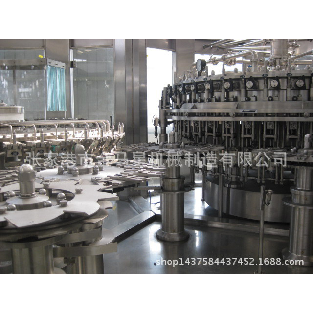 本設備主要用于含汽飲料灌裝,包含沖瓶灌裝和旋蓋三大主要功能。本設備實現全自動運行,能夠適應PET瓶含汽果汁、含汽礦泉水及可樂與雪碧等灌裝。瓶型適應性強,更換瓶型時操作簡單快捷。灌裝方案中采用了等壓灌裝原理,灌裝快速穩定,液位準確,含汽量足。與同類設備相比,本公司產品產量高,運行穩定安全,故障率低,自動化長度高,價格經濟實惠。全機采用優良可編程控制器(PLC)來控制設備的自動運行,送瓶系統由變頻器改變速度,更加穩定可靠。每個部分都有光電單元進行監測,所以更加自動化,操作更加便捷。在此基礎上,更換灌裝單元即可改變灌裝模式到低壓真空灌裝和等壓灌裝等。本設備是飲料企業的選擇。